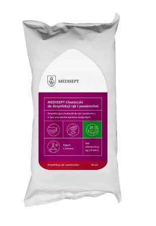 MEDISEPT Chusteczki do dezynfekcji rąk i powierzchni to wysokiej jakości, alkoholowe chusteczki przeznaczone do higienicznej dezynfekcji rąk oraz wszelkich małych powierzchni odpornych na działanie alkoholu. Zalecane są do takich powierzchni jak blaty, klamki, uchwyty, powierzchnie siedzisk, sprzęt medyczny i akcesoria wykonane z tworzyw sztucznych, stali szlachetnej, porcelany, tworzywa ABS. Produkt ze względu na przeznaczenie do skóry zawiera dodatki substancji pielęgnujących, które nawilżają dłonie.